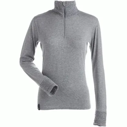 Lightweight heathered 1/4 zip t-neck with natural wicking properties, thumb thongs and self fabric ribbing on collar and cuffs.